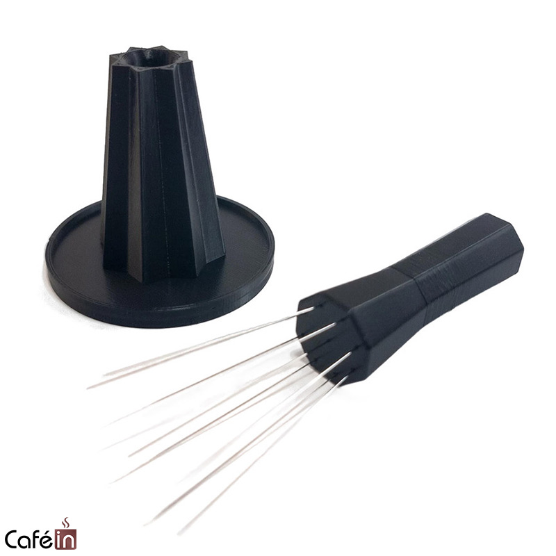 نیدل قهوه سر سوزنی مدل WDT وسیلهای برای توزیع یکنواخت و باز کردن پودر قهوه است. در این روش با کمک یک سوزن ظریف یا ابزار مشابه قهوه داخل پرتافیلر هم زده میشود. در قسمت بالای پرتافیلر یک قیف قرار دارد که از ریختن قهوه هنگام هم زدن با نیدل سوزنی قهوه جلوگیری میکند. با هم زدن تودههای پودر قهوه از هم جدا میشوند و چگالی قهوه یکنواخت میگردد. در نتیجه استخراج قهوه بیشتر و یکنواخت تر انجام میگردد.